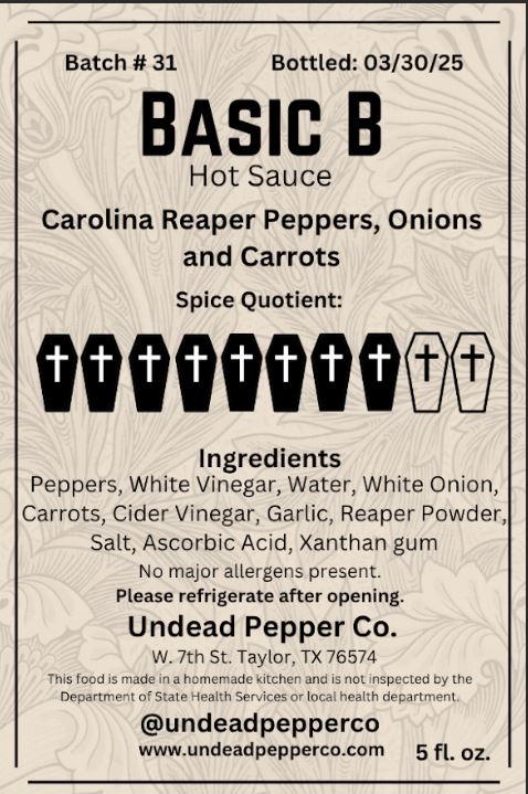 Meet Basic B, a no-nonsense sauce that gets straight to the point—blistering heat. Made with Carolina Reaper peppers, the hottest peppers on Earth, this sauce is not for the faint of heart. The fiery intensity is perfectly balanced with the bold flavors of onion and garlic, creating a sauce that’s as flavorful as it is painful. Whether you’re daring enough to use it as a fiery topping or adding a few drops to your dishes, Basic B brings the heat you crave—no frills, just fire.