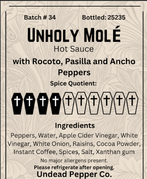 Dive into the depths of heat and flavor with Unholy Mole, our devilishly complex mole-style hot sauce that walks the fine line between heaven and hell. Crafted in small, seasonal batches, this unholy union of ancho chilies, Pasilla chilies, and rare Rocoto peppers delivers a smoky, layered heat that seduces before it scorches.